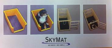 Along with your pets travelling crate, we supply him/her with a special ‘Sky Mat’. The Sky Mat is a stay dry absorbent, non- slip material. Should your pet urinate throughout the flight, moisture will sink to the bottom keeping the top dry and fresh. Special crystals in the matting draw odour away.